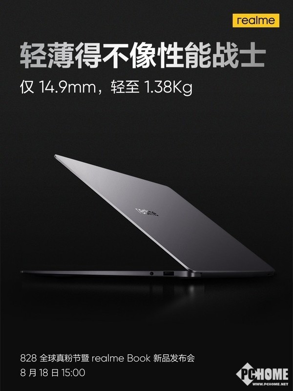 明日下午3点,realme首款笔记本realme Book将正式亮相。它拥有铝合金全金属机身,采用行业领先的CNC钻石切割工艺和精密喷砂工艺。历经30余道工序精心打造,高端质感,一流手感。薄至14.9mm,轻至1.38Kg,出行零负担,是真正的性能轻薄本。