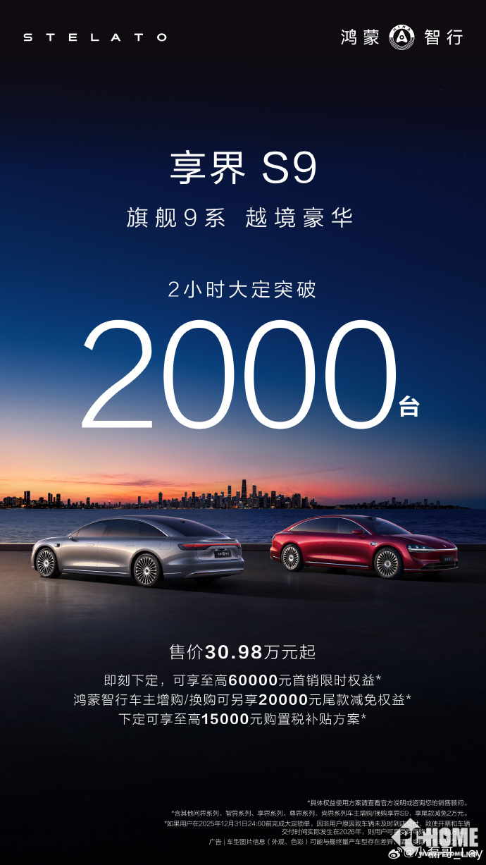 11月20日,鸿蒙智行新款享界S9正式发布,新车定位“全景智慧旗舰轿车”,售价30.98万元-36.98万元。随后华为智选车产品总监(享界系列)彭磊在社交媒体平台宣布,新车上市2小时大定破2000台。
