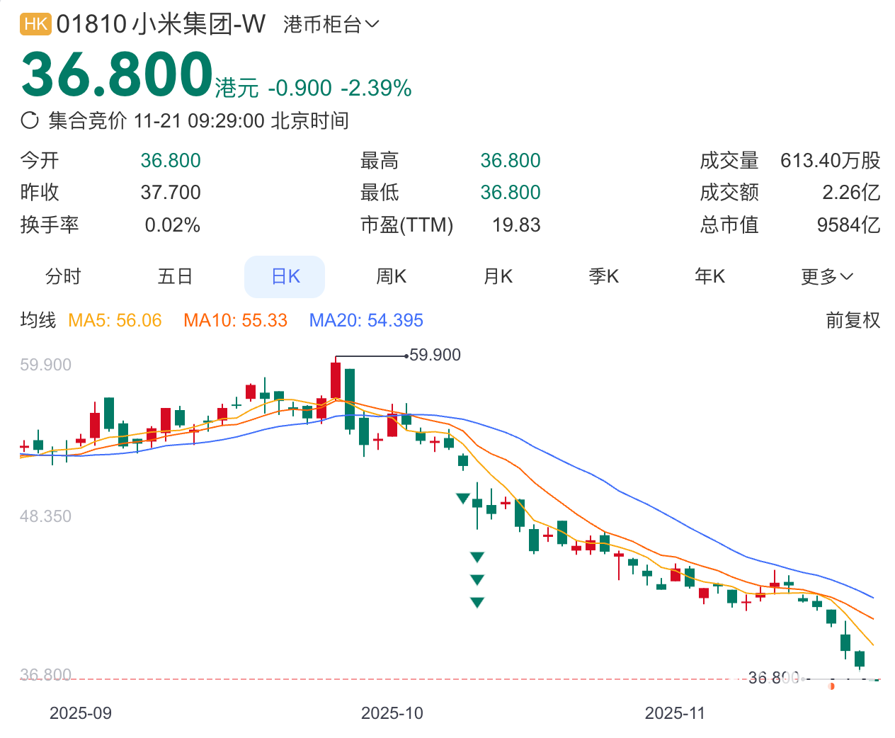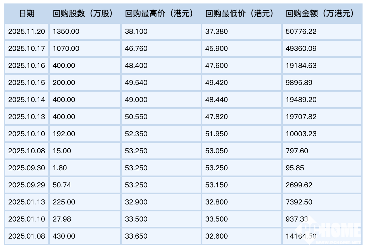 2025年11月20日,小米集团在港交所发布回购公告称,将以平均价37.61港币/股,回购1350万股,总耗资超5.07亿港币,创上市以来最大单日回购金额纪录。