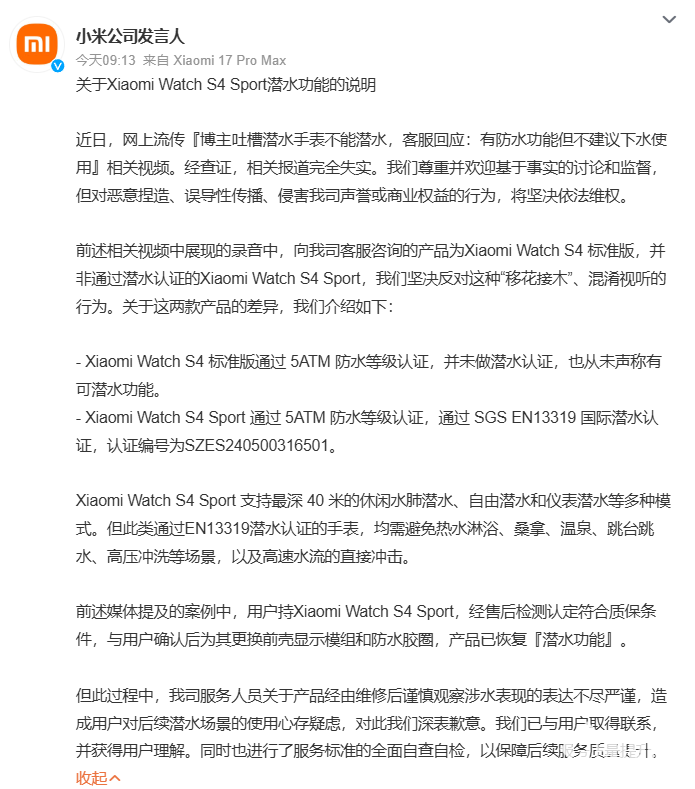 起因是一位博主吐槽潜水手表不能潜水,客服回应:有防水功能但不建议下水使用。小米官方经查证,称对于此事的相关报道完全失实。博主所吐槽的手表型号为Xiaomi Watch S4标准版,这款手表只通过5ATM防水等级认证,并未做潜水认证,也从未声称有潜水功能。容易与Xiaomi Watch S4 Sport这款型号弄混淆,这款手表通过了5ATM防水等级认证,也通过了SGS EN13319国际潜水认证,认证编号为SZES240500316501。