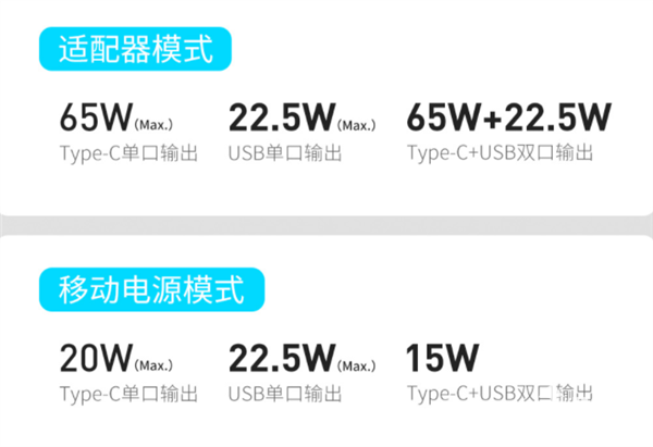 它还支持最高87W双路同时快充,分别为Type-C 65W和USB 22.5W输出,满足笔记本和手机的同时快充。