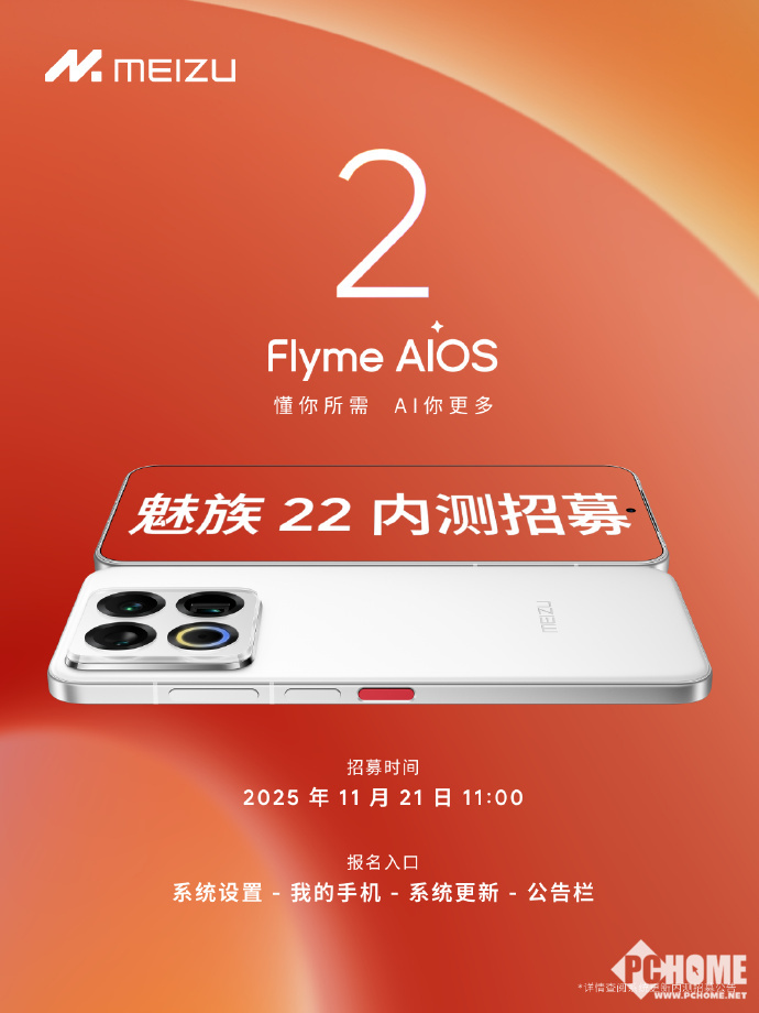 Flyme AIOS官方于11月21日发博公布魅族22 Flyme AIOS 2开启内测招募,报名入口为:系统设置-我的手机-系统更新-公告栏,报名版本要求Flyme 12.3.1.3A。