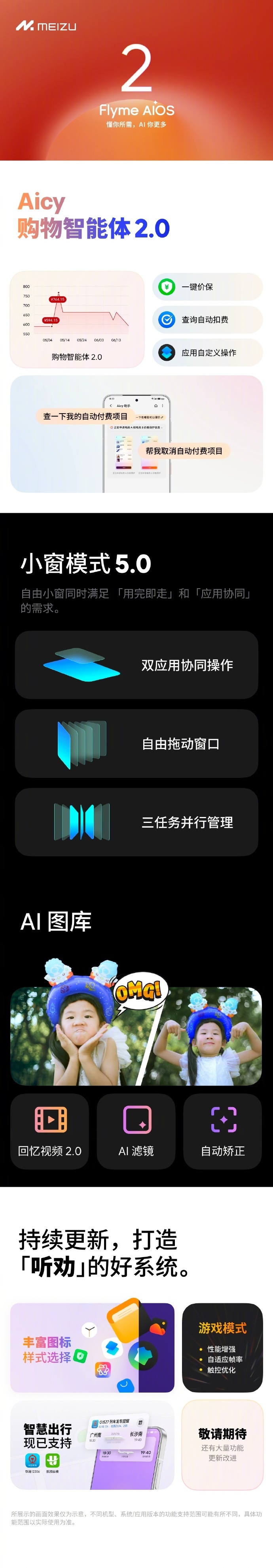 Flyme AIOS是魅族于2024年推出的以AI为核心的全新操作系统,取代了Flyme OS。最新版本的Flyme AIOS 2在此前就已随着魅族22旗舰手机正式发布。内测版本将带来Aicy购物智能体2.0,实现一键报价,查询自动扣费,以及应用自定义操作。小窗模式也迎来了5.0版本,双应用系统操作,可以自由拖动窗口,实行三任务并行管理,同时满足“用完即走”和“应用协同”的需求。AI图库,回忆视频2.0,AI滤镜,自动矫正,动图拼贴等实现一键混搭。游戏模式下,性能增强,能够自适应帧率以及触控优化。打造智慧出行,接入铁路12306/航旅纵横,锁屏/通知栏实时显示车次、座位号、检票口信息。百度地图深度联动,打车/骑行导航状态同步至实况通知。