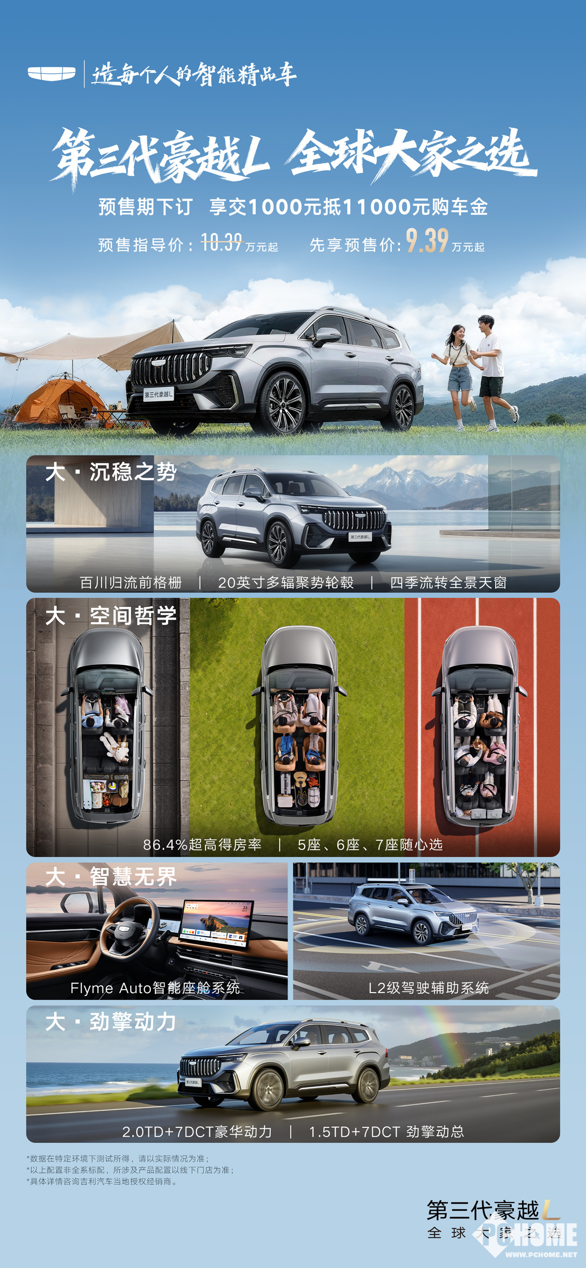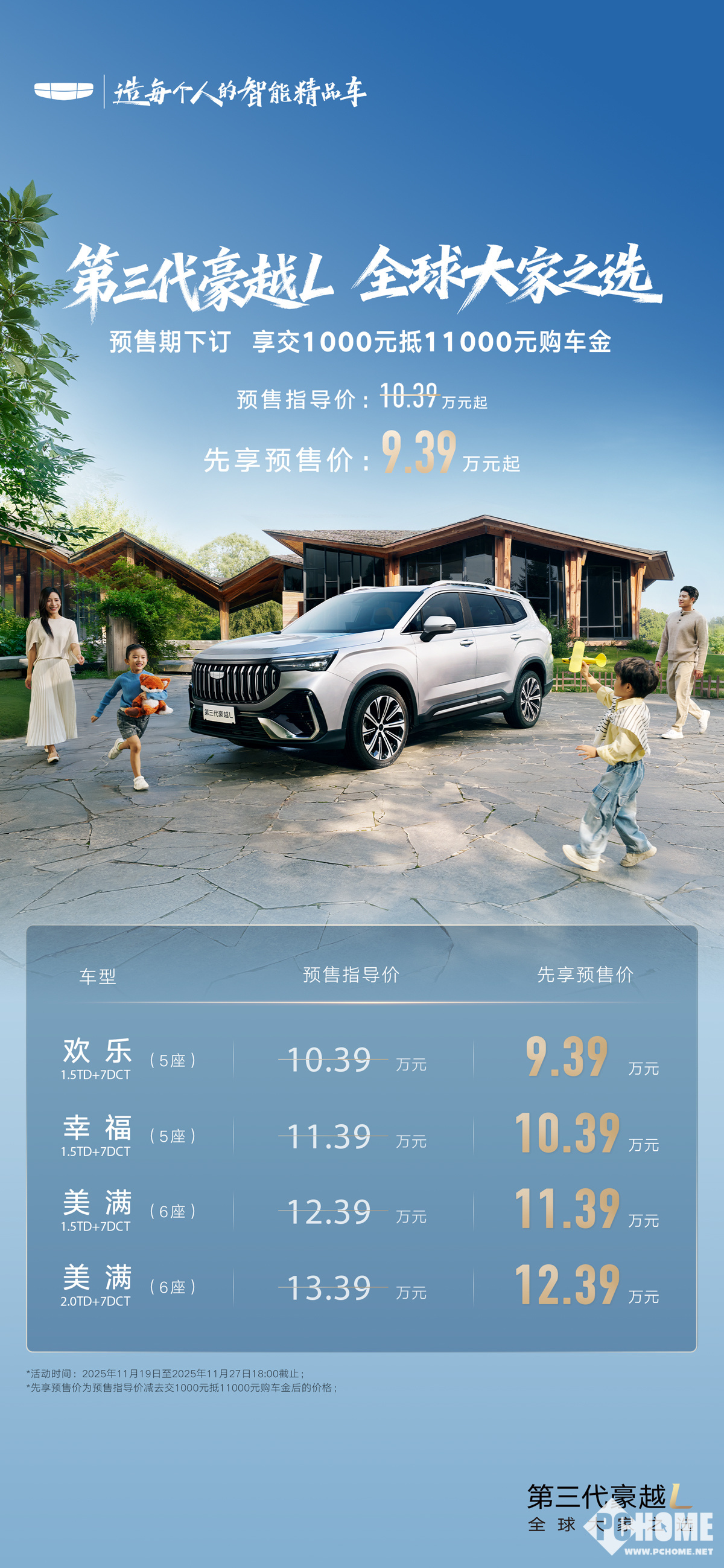 2025年11月22日,吉利汽车宣布,第三代豪越L车型开启预售,计划11月27日上市,该车型共推出了四个版本,预售指导价10.39万元起,先享预售价9.39万元起。