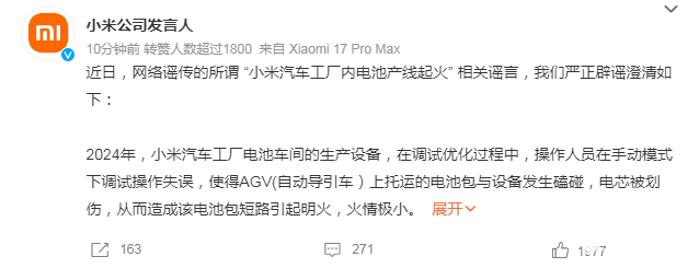 2025年11月23日消息,“小米公司发言人”账号发布官方辟谣,近日,网传“小米汽车工厂内电池产线起火” 相关信息为谣言。系2024年,小米汽车工厂生产设备优化调试,因操作人员作失误引起明火,并非电池本身问题。