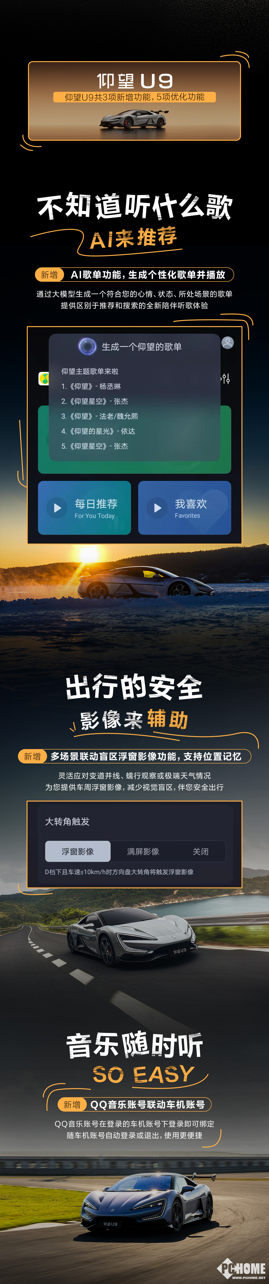仰望U9同时也新增了多场景联动盲区浮窗影像,并且支持位置记忆。以外,仰望U9还新增了AI歌单功能和QQ音乐账号联动车机账号等功能,可以生成个性化歌单并播放,QQ音乐账号在登陆的车机账号下登陆即可绑定,随车机账号自动登陆或退出。