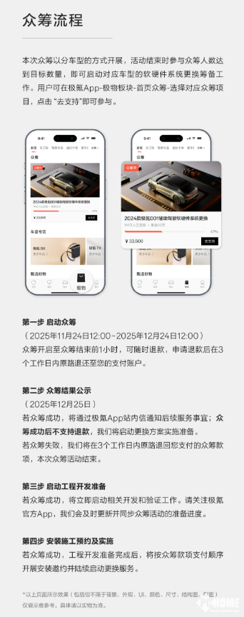 2025年11月24日,极氪Zeekr官方微博发布,面向搭载激光雷达的2024款极氪001和极氪009的辅助驾驶软硬件系统更换众筹项目,今日正式上线。