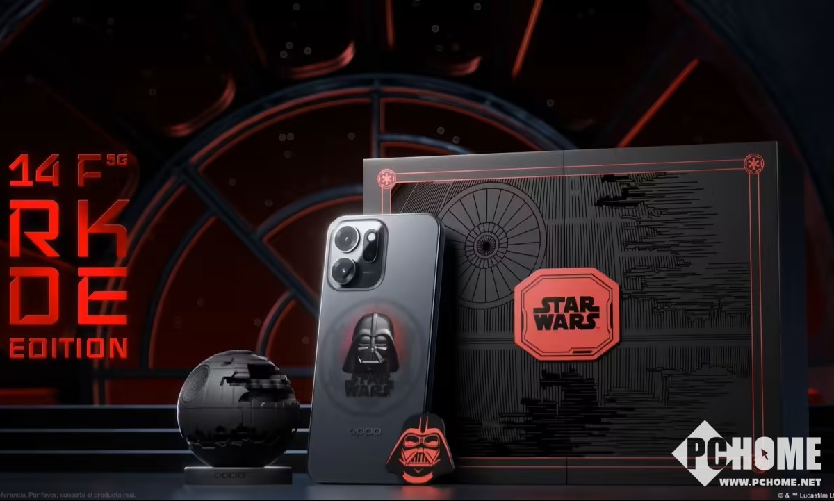 据了解,《星球大战》联名版Reno 14F手机最大亮点在于它的设计,机身整体采用暗黑设计,背部有达斯·维德头盔图案、死星标志等元素,边框为深灰色,电源键红色点缀,并且,该手机配备了红色透明手机壳、同色系充电线、死星二号手机支架,SIM卡针为达斯·维德头像。