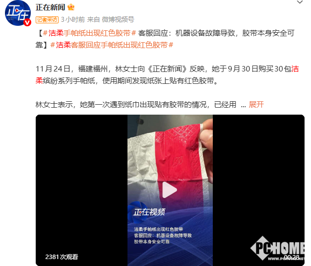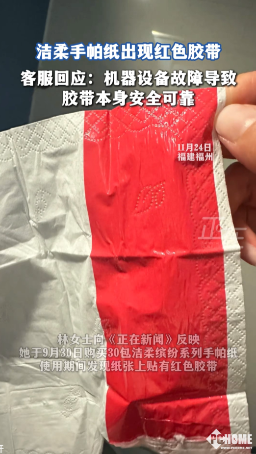 2025年11月24日消息,正在新闻报道,有消费者反映,自己购买的“洁柔缤纷系列手帕纸”,在使用过程中发现,手帕纸上竟贴有红色胶带,疑似生产线残留物。洁柔官方客服回应称,材料安全无毒,符合欧盟相关标准,且拥有检测报告。