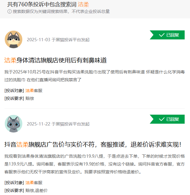 据黑猫投诉平台显示,针对“洁柔”投诉760条,有消费者称,洁柔洗脸巾有刺鼻味道。还有消费者表示,洁柔纸巾发现疑似虫子的异物。