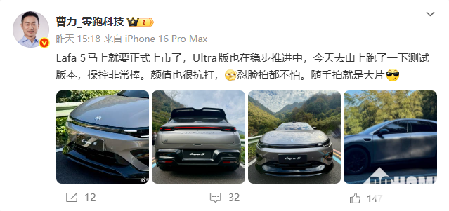 2025年11月23日,零跑科技高级副总裁曹力晒出了一组Lafa5 Ultra的实车图,并发微博称:Lafa5马上就要上市了,Ultra版也在稳步推进中,今天去山上跑了一下测试版本,操控非常棒,颜值也抗打,怼脸拍都不怕,随手就是大片。