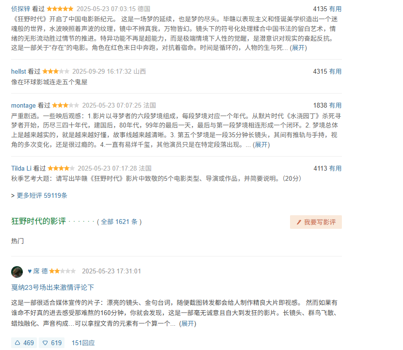 但在内地放映时,网友的评价却呈两极分化,看懂的网友表示,“《狂野时代》开启了中国电影新纪元,这是一场梦的延续,也是梦的尽头”,“有漂亮的镜头,金句台词。”看不懂的网友则表示,“像在环球影城连走五个鬼屋。”而更多的则表示影片太过无聊,第一次在看电影时玩手机、睡着等等。