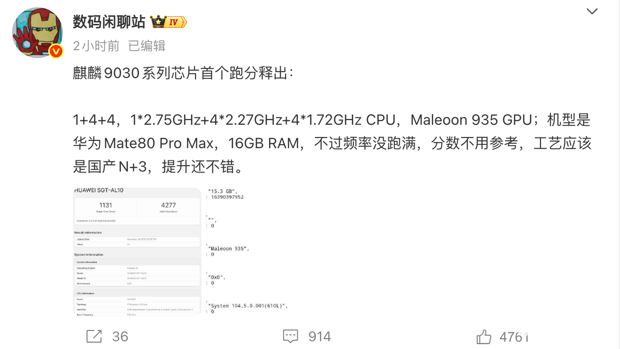 发布会开始前,知名数码博主“数码闲聊站”曝光了麒麟9030系列的参数,其采用1+4+4的9核心设计,包括1*2.75GHz+4*2.27GHz+4*1.72GHz CPU,Maleoon 935 GPU,“工艺应该是国产N+3,提升还不错。”