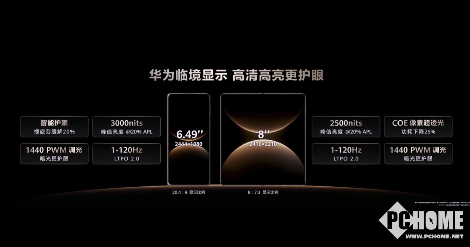 屏幕方面,华为Mate X7外屏为6.49英寸,分辨率为2444×1080,内屏达8英寸,分辨率为2416×2210,搭载华为临境显示技术,支持3000nits峰值亮度与1440Hz PWM调光,同时通过COE像素超透光技术降低25%功耗,兼顾显示效果与续航。