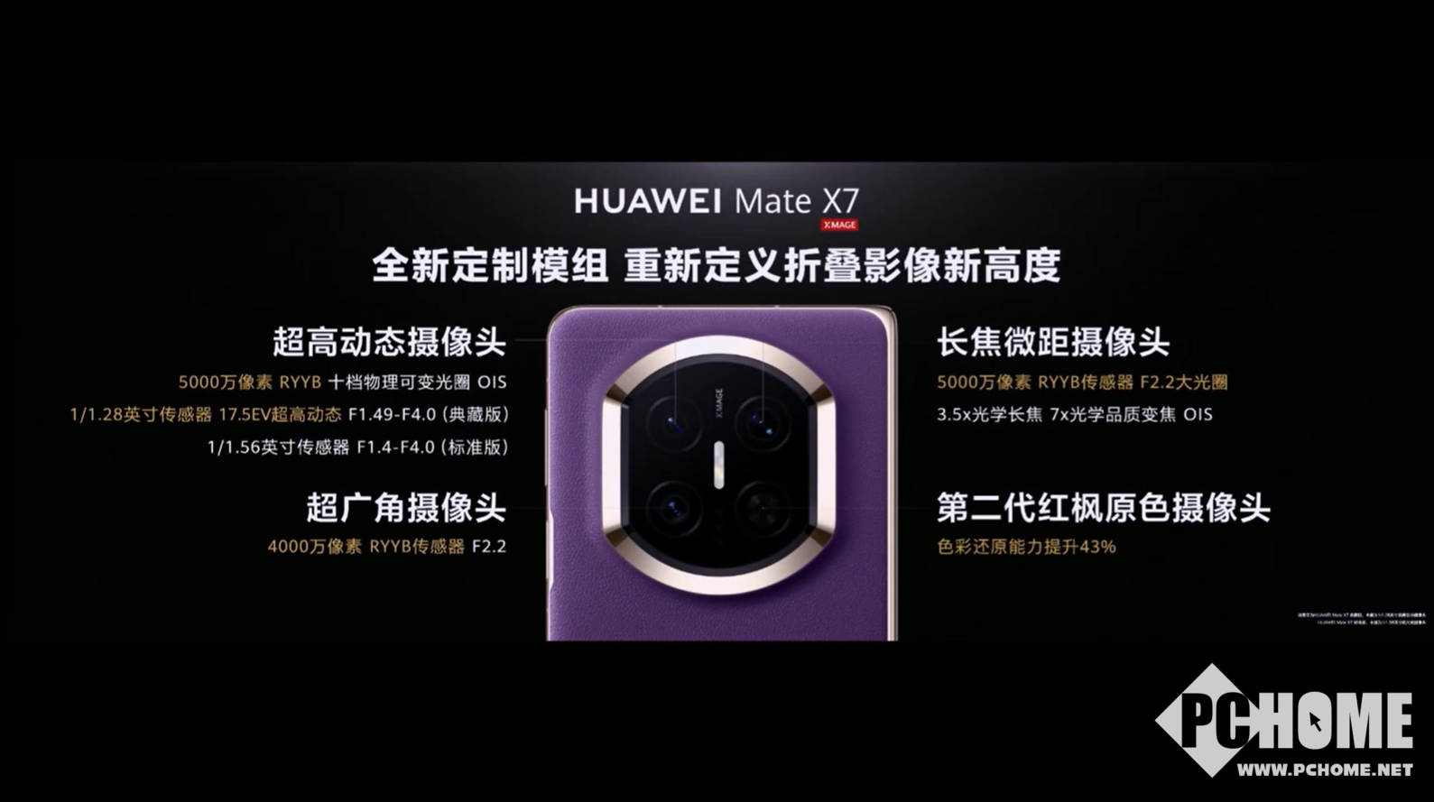 影像方面,华为Mate X7全新定制模组包含5000万像素RYB可变光圈主摄(典藏版配备1/1.28英寸传感器)、3.5x光学长焦微距镜头,以及第二代红枫原色摄像头,色彩还原能力提升43%,彻底摆脱折叠屏“影像凑数”的标签。