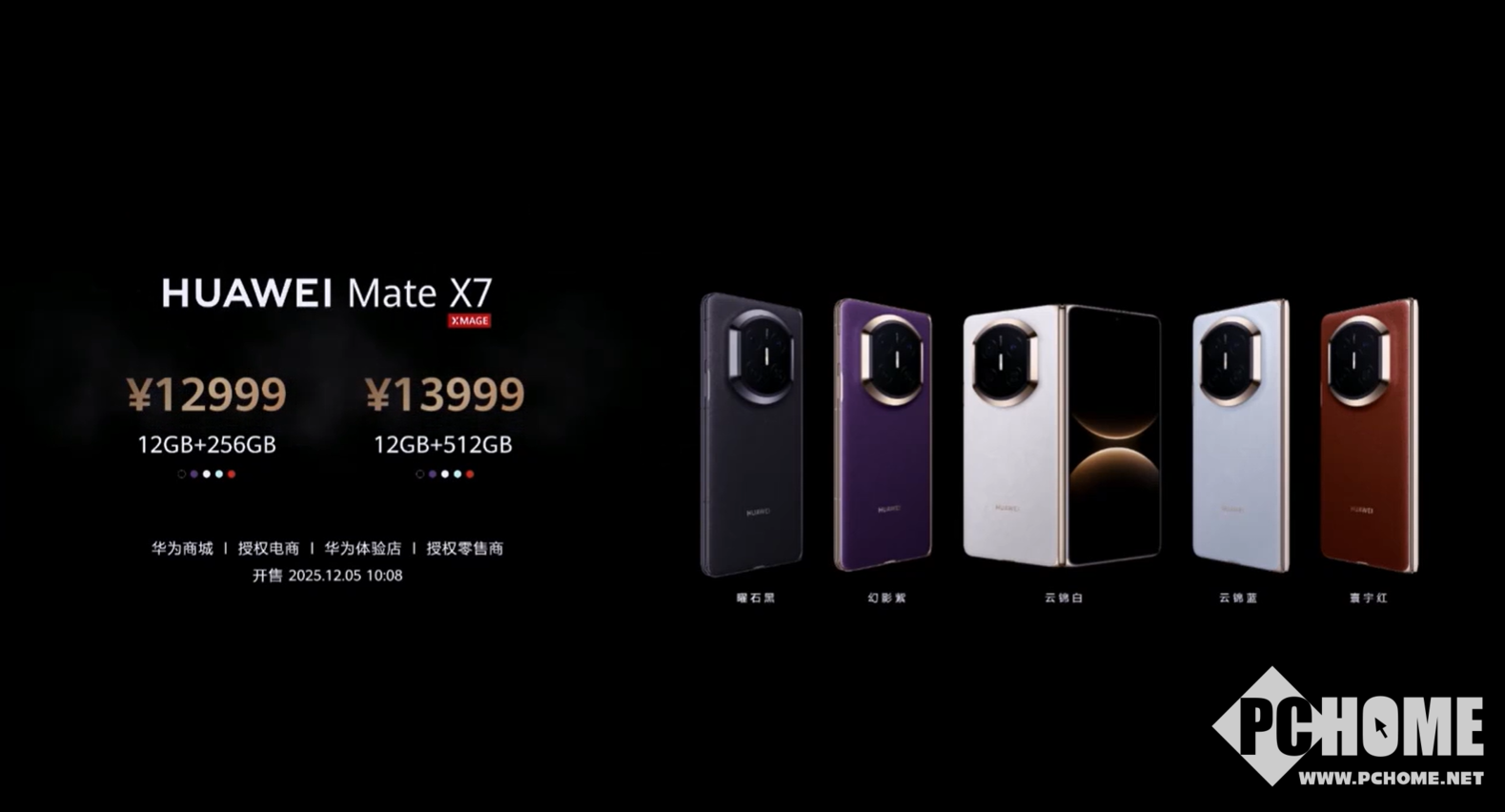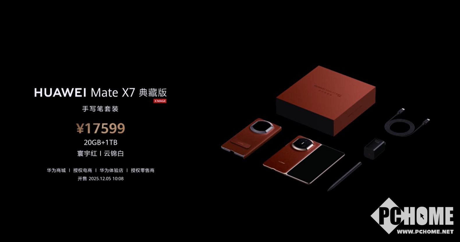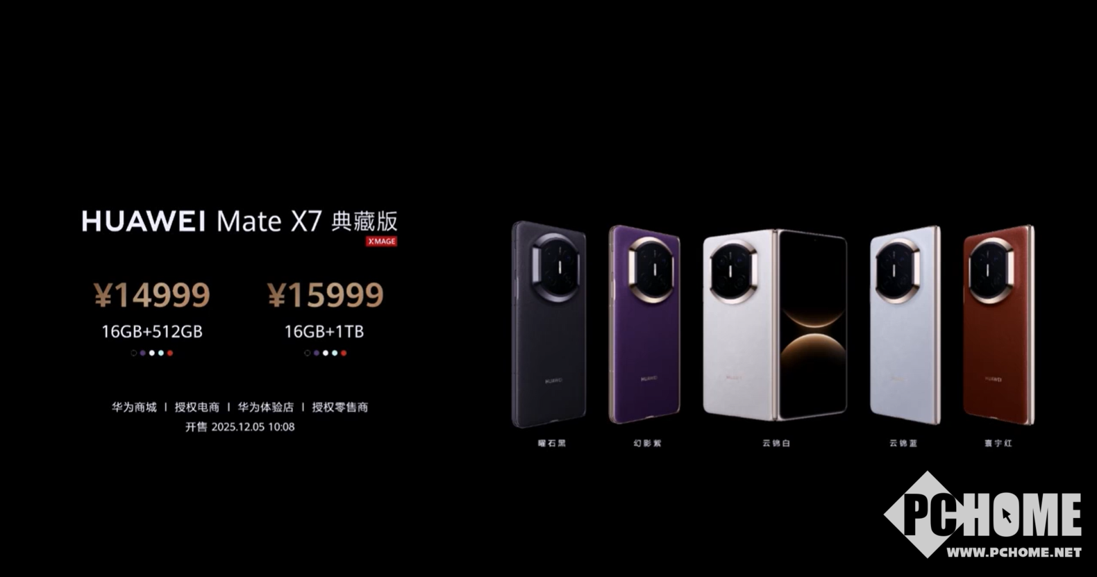 价格方面,Mate X7 12GB+256GB版起售价12999元,12GB+512GB版13999元;典藏版16GB+512GB版14999元,16GB+1TB版15999元;最高20GB+1TB手写笔套装版售价17599元,将于12月5日10:08正式开售。