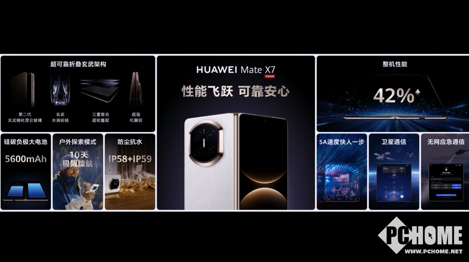 华为Mate X7搭载5600mAh硅碳负极电池,支持户外探索模式10天极限续航,同时标配卫星通信与无网应急通信功能,极端环境下仍能保持连接。机身还通过IP58+IP59防尘抗水认证,耐用性进一步增强。