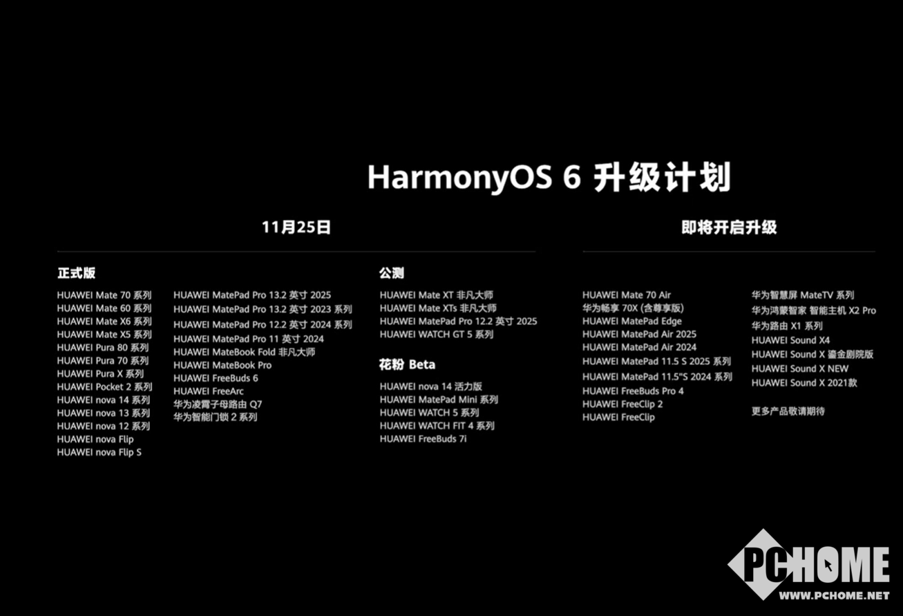 2025年11月25日,在华为Mate 80系列新品发布会上,华为HarmonyOS 6升级计划公布,包含手机、电脑、平板等。