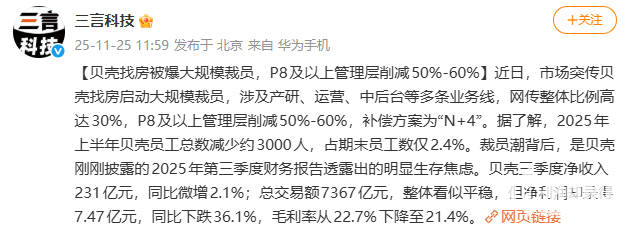 2025年11月25日消息,据三言科技报道,贝壳找房启动大规模裁员,网传裁员比例高达30%,公司高管成重灾区,职级P8及以上管理层裁撤比例达50%-60%,涉及产研、运营、中后台部门等多条业务线。