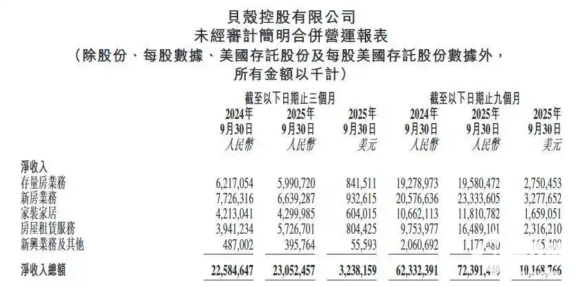 据公开资料显示,贝壳2025年第三季度总交易额达7367亿元,同比基本持平,净利润为7.47亿元,同比下滑36.1%,经调整净利润为12.86亿元,同比下降27.8%。其中,家装家居业务净收入43亿元,贡献利润率提升至32%。房屋租赁服务净收入达57亿元,同比增长45.3%。
