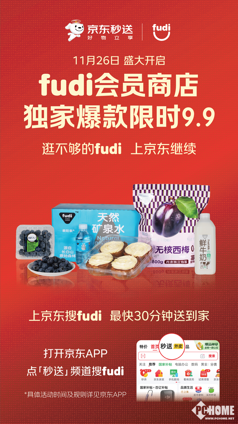 为庆祝合作落地,11月26日起用户在京东秒送搜索“fudi”,可享9.9元限量爆款优惠,新会员还能获188元券包,体验高品质商品的分钟级送达服务。