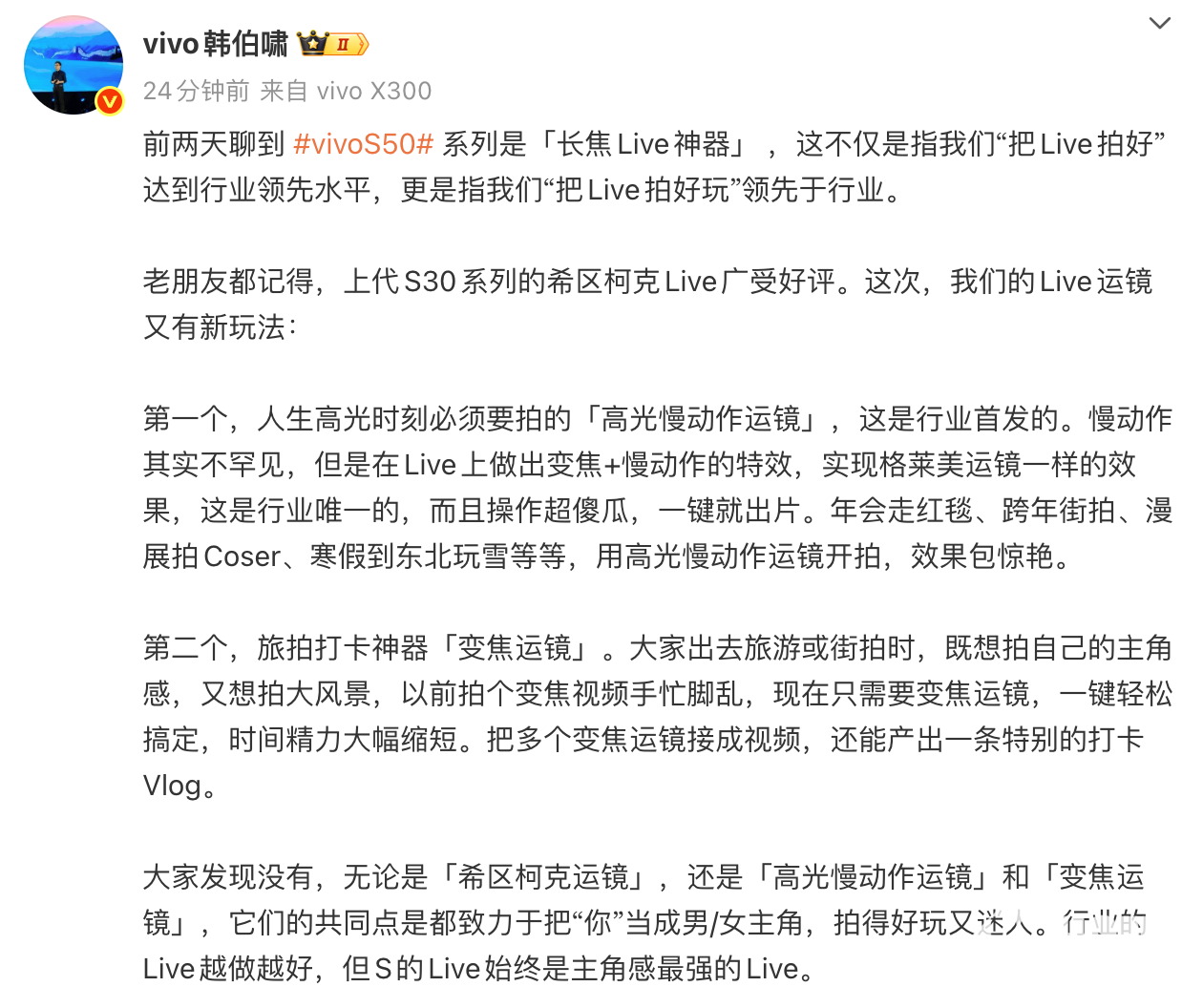11月26日,韩伯啸发文称,vivo S50系列Live拍摄有新玩法:1、行业首发高光慢动作运镜,可做出变焦+慢动作特效,实现格莱美运镜一样的效果;2、旅拍打卡神器“变焦运镜”,以前拍个变焦视频手忙脚乱,现在只需要变焦运镜,一键轻松搞定,时间精力大幅缩短。把多个变焦运镜接成视频,还能产出一条特别的打卡Vlog。