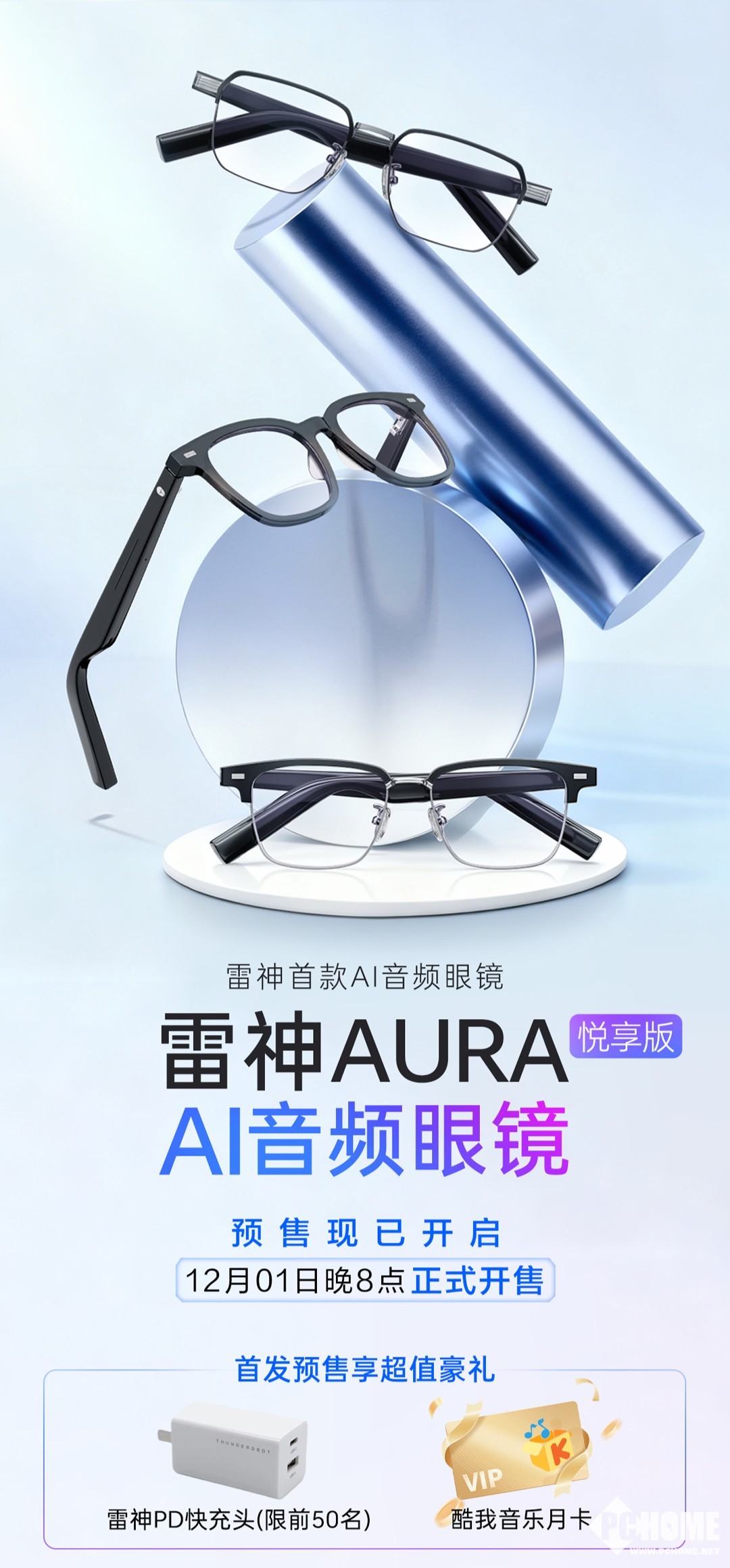 2025年11月26日,雷神科技官方微博发文,雷神首款AI音频眼镜雷神AURA悦享版开启预售,售价为599元起,将于12月1日20:00开售。