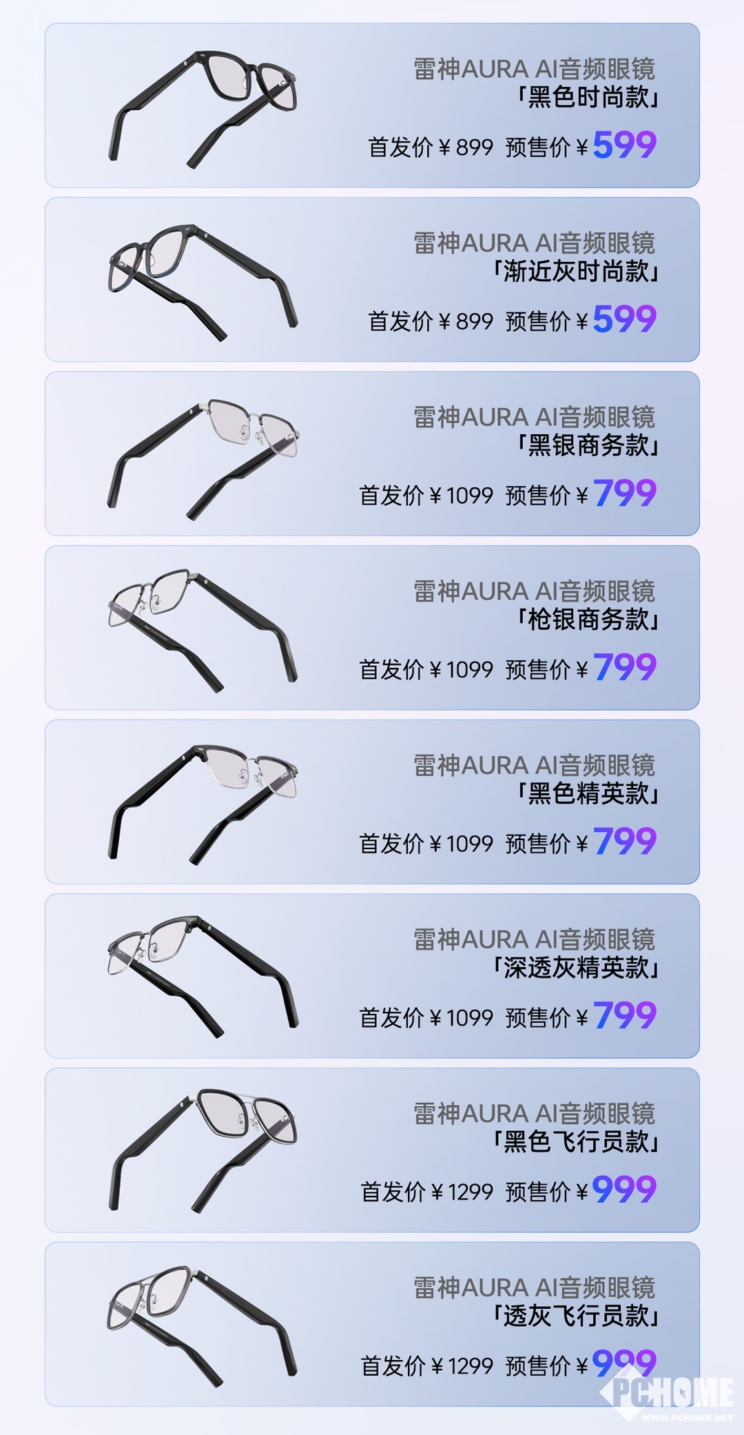 雷神AURA悦享版眼镜提供四类八款眼镜框选择,包括时尚款(售价599元),商务款/精英款(售价799元),飞行员款(售价999元),可自由更换光学镜片。