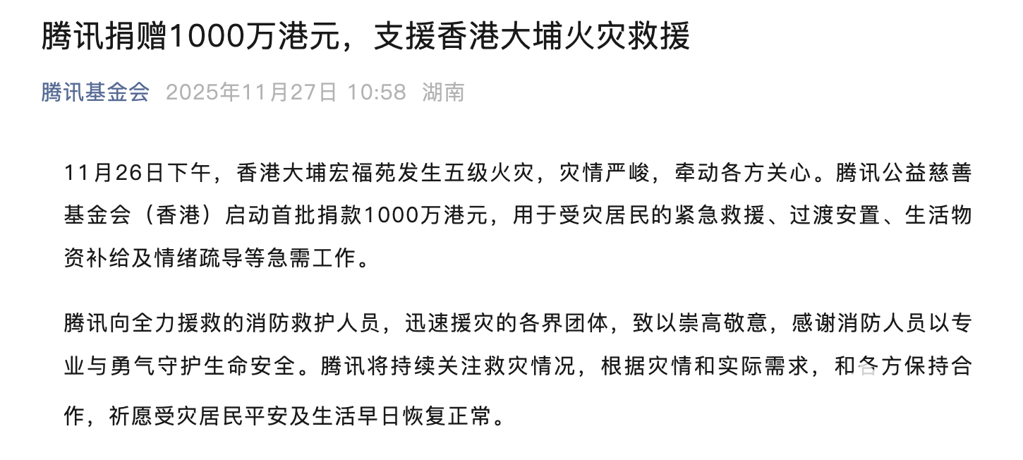 11月27日,腾讯基金会发文称,腾讯公益慈善基金会(香港)启动首批捐款1000万港元,用于受灾居民的紧急救援、过渡安置、生活物资补给及情绪疏导等急需工作。