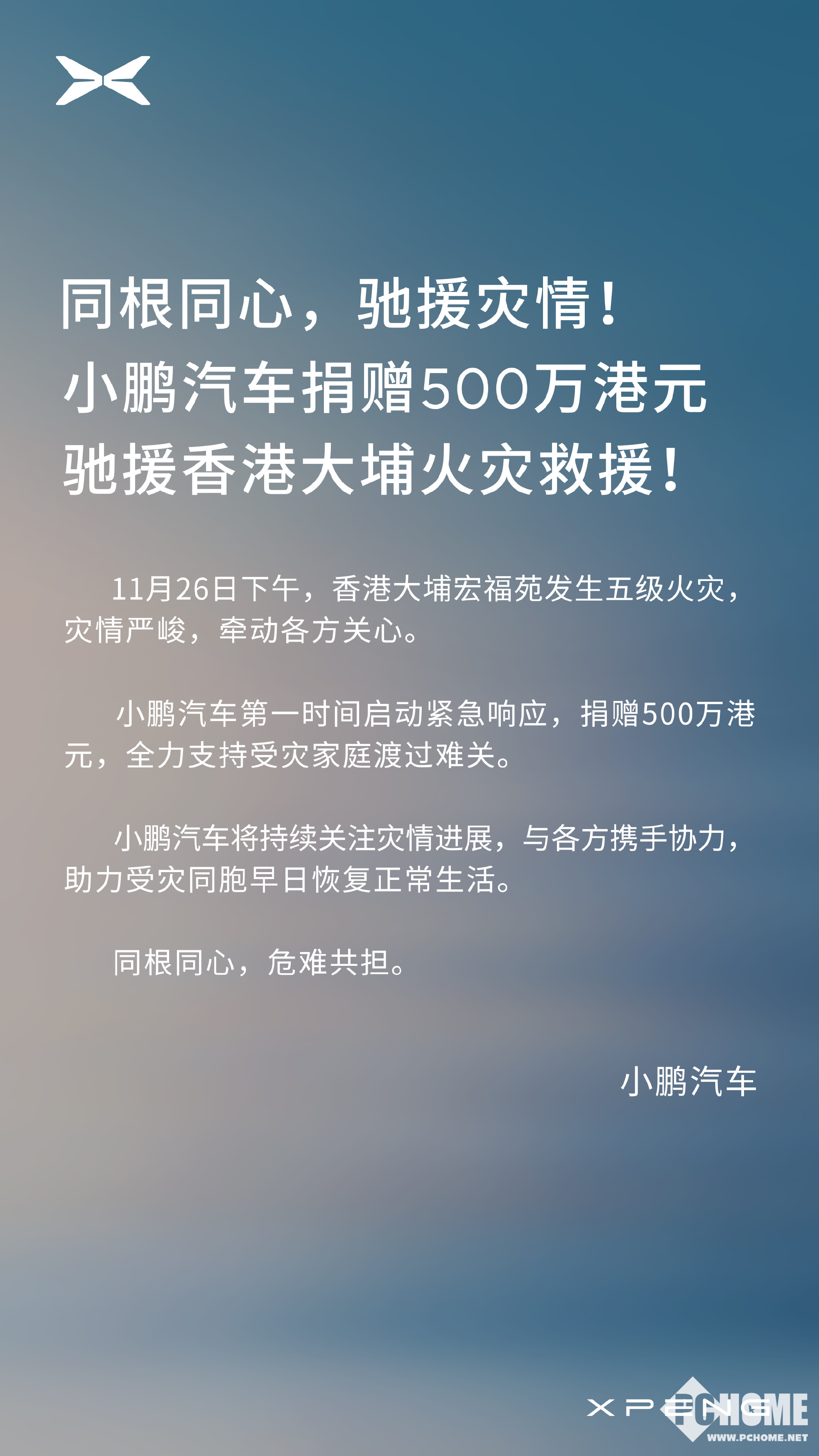 小鹏汽车发布公告称,小鹏汽车第一时间启动紧急响应,捐赠500万港元,全力支持受灾家庭渡过难关。小鹏汽车将持续关注灾情进展,与各方携手协力,助力受灾同胞早日恢复正常生活。