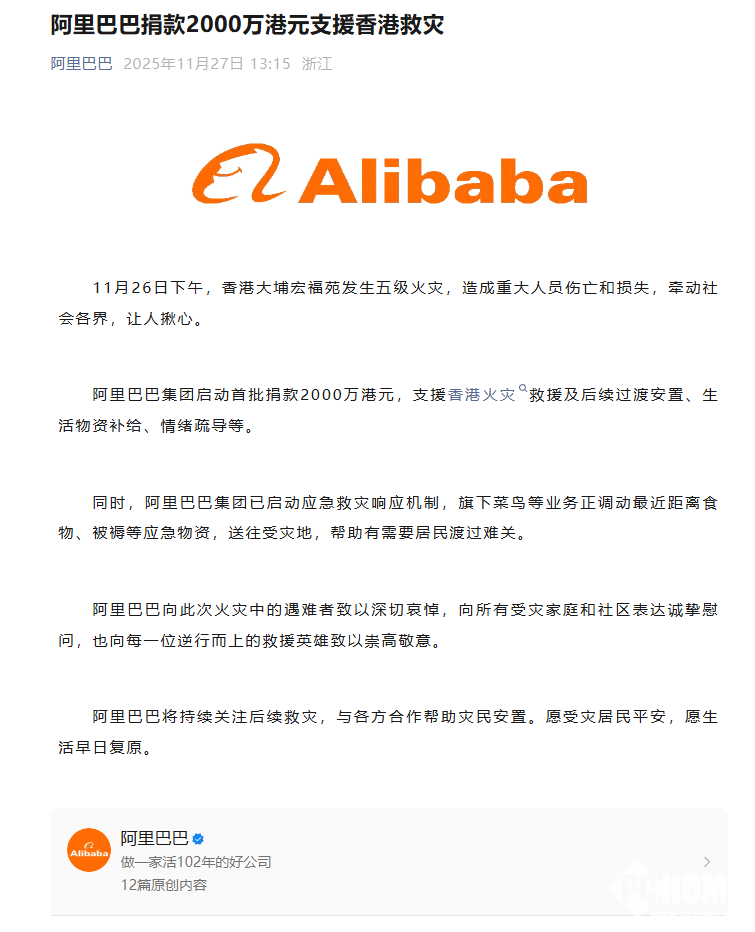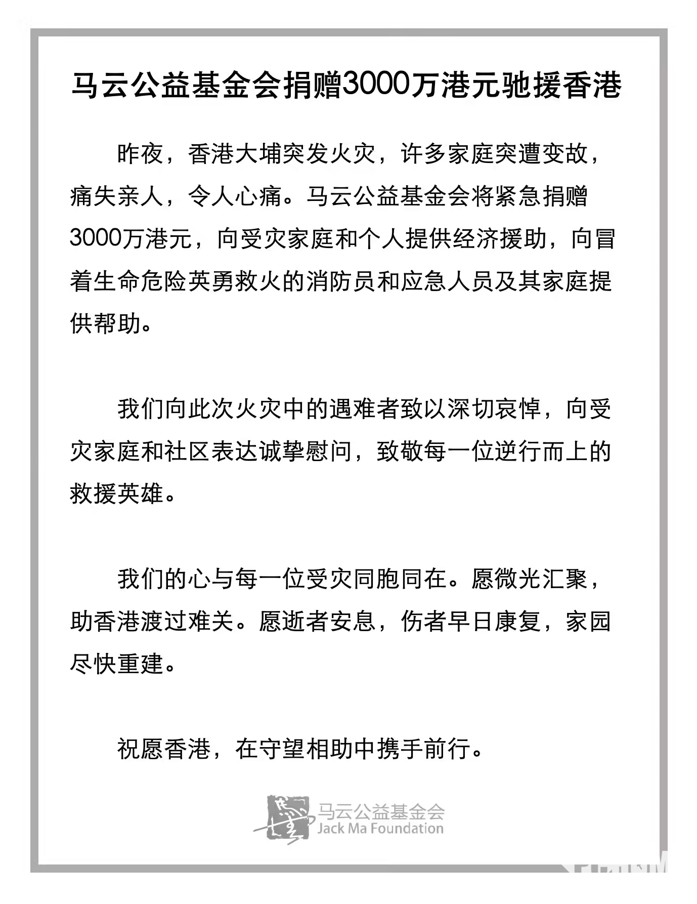 2025年11月27日,马云及阿里巴巴集团、蚂蚁集团总共捐款6000万港元,支持中国香港火灾救援。