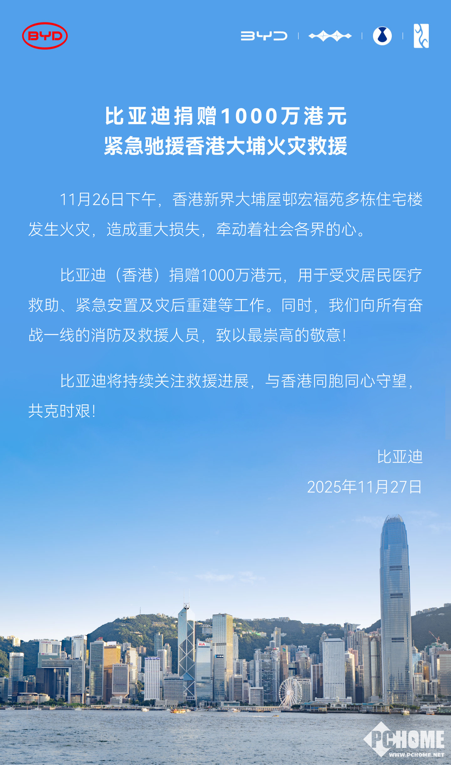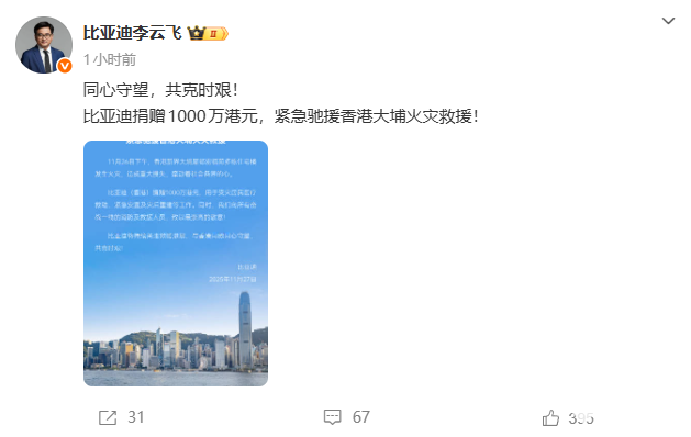 2025年11月27日,比亚迪集团总经理李云飞官宣,比亚迪捐款1000万港元,支持香港火灾救援。