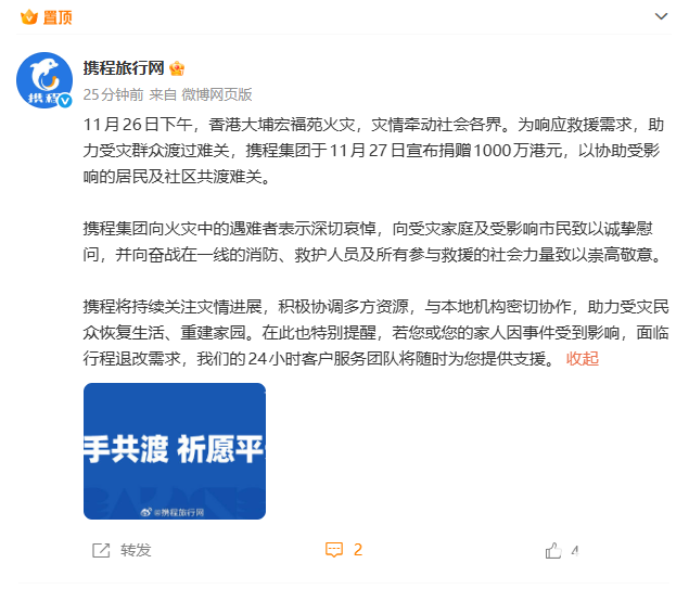 2025年11月27日,携程集团官宣捐款1000万港元,协助中国香港受影响的居民及社区共渡难关。