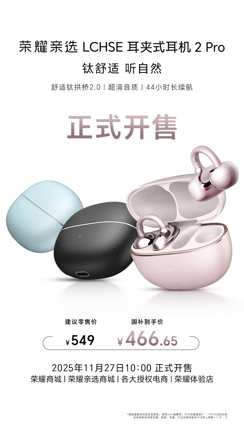 2025年11月27日,荣耀手机微博官宣,荣耀亲选LCHSE耳夹式耳机2 Pro今日十点正式开售,官方定价549元,国补售价为466.65元。