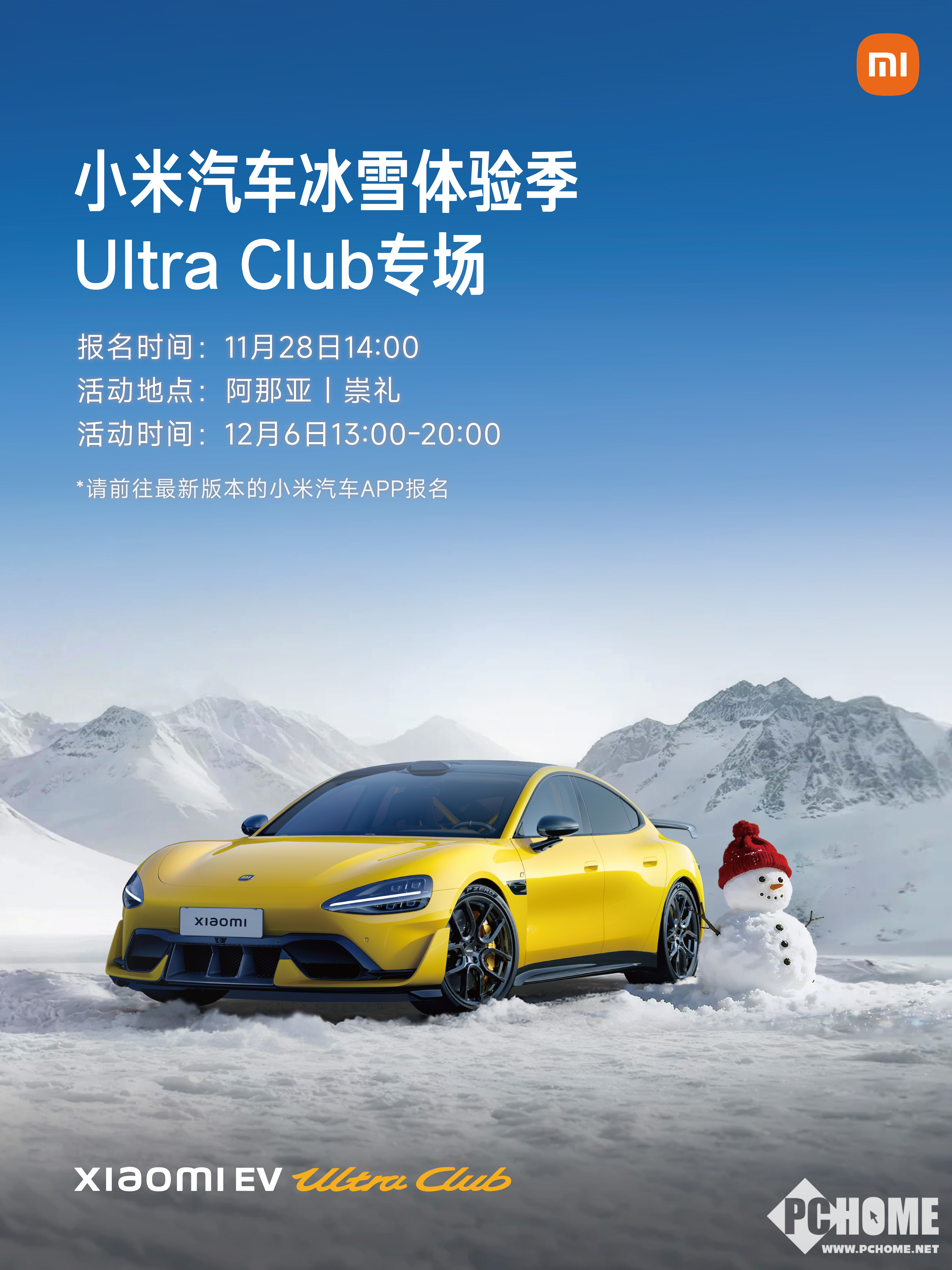 2025年11月27日,小米汽车官方微博发布,小米汽车冰雪体验季-Ultra Club专场,于11月28日下午14点面向Ultra Club会员开启报名,活动名额共22个,地点位于阿那亚·崇礼,费用包括报名费与住宿费两部分:报名费为249元(仅限Ultra Club专场),住宿费为1250元(需自行向酒店支付)。
