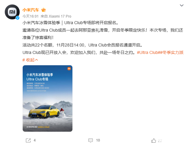 2025年11月27日,小米汽车官方微博发布,小米汽车冰雪体验季-Ultra Club专场于11月28日下午14点面向Ultra Club会员开启报名,活动名额共22个。
