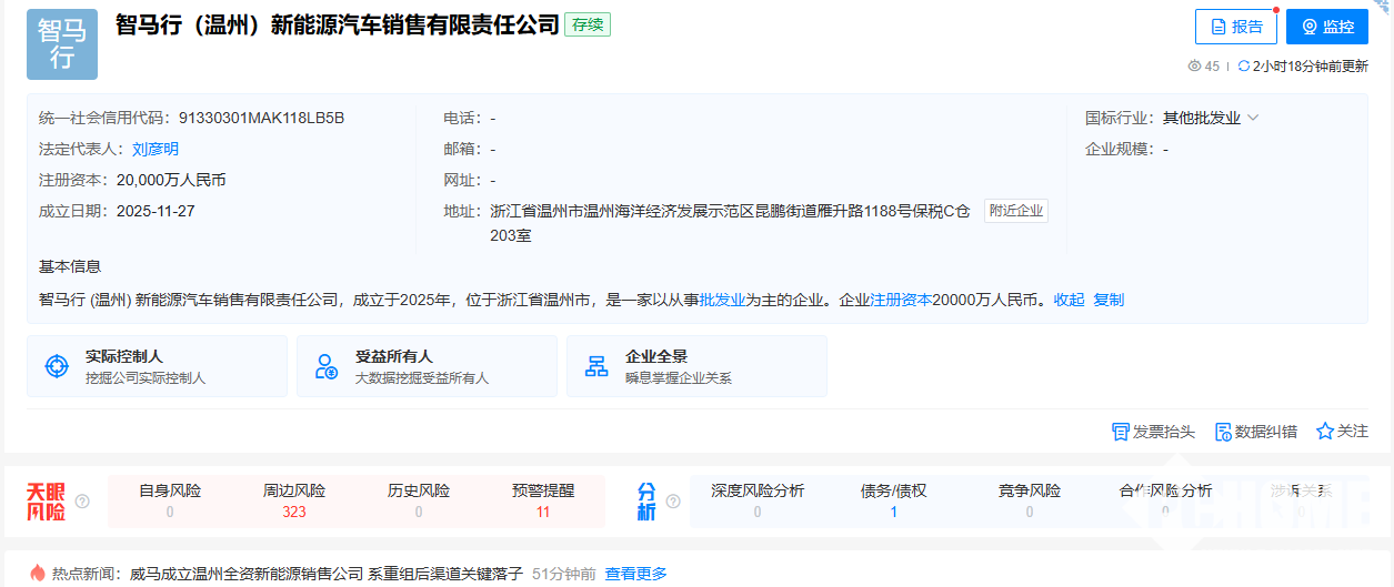 2025年11月27日消息,据天眼查数据显示,智马行(温州)新能源汽车销售有限责任公司成立,该公司由威马汽车制造温州有限公司全资持股,注册资本2亿人民币。11月3日,威马汽车曾在社交媒体发文预告,“好事将近,敬请期待”,种种迹象表明与新公司成立相关。