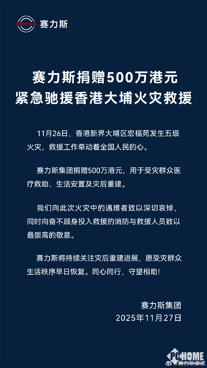 11月27日,赛力斯集团副总裁康波今日宣布,赛力斯集团捐赠500万港元紧急驰援香港大埔火灾救援。该笔捐款将专项用于受灾群众医疗救助、临时生活安置及后续灾后重建等关键环节,为救援工作注入及时力量。