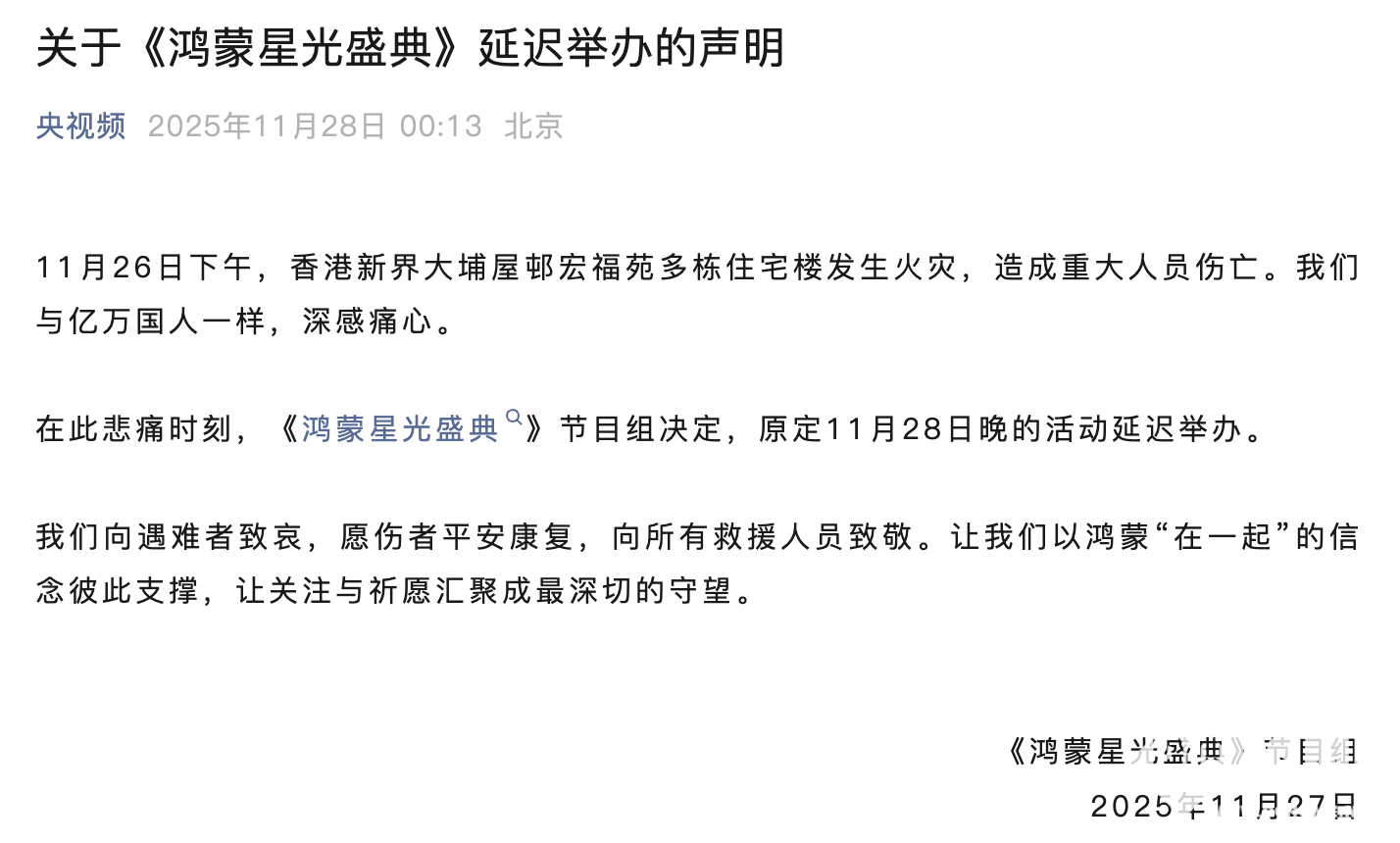 在此悲痛时刻,《鸿蒙星光盛典》节目组决定,原定11月28日晚的活动延迟举办。《鸿蒙星光盛典》节目组表示,“我们向遇难者致哀,愿伤者平安康复,向所有救援人员致敬。让我们以鸿蒙‘在一起’的信念彼此支撑,让关注与祈愿汇聚成最深切的守望。”