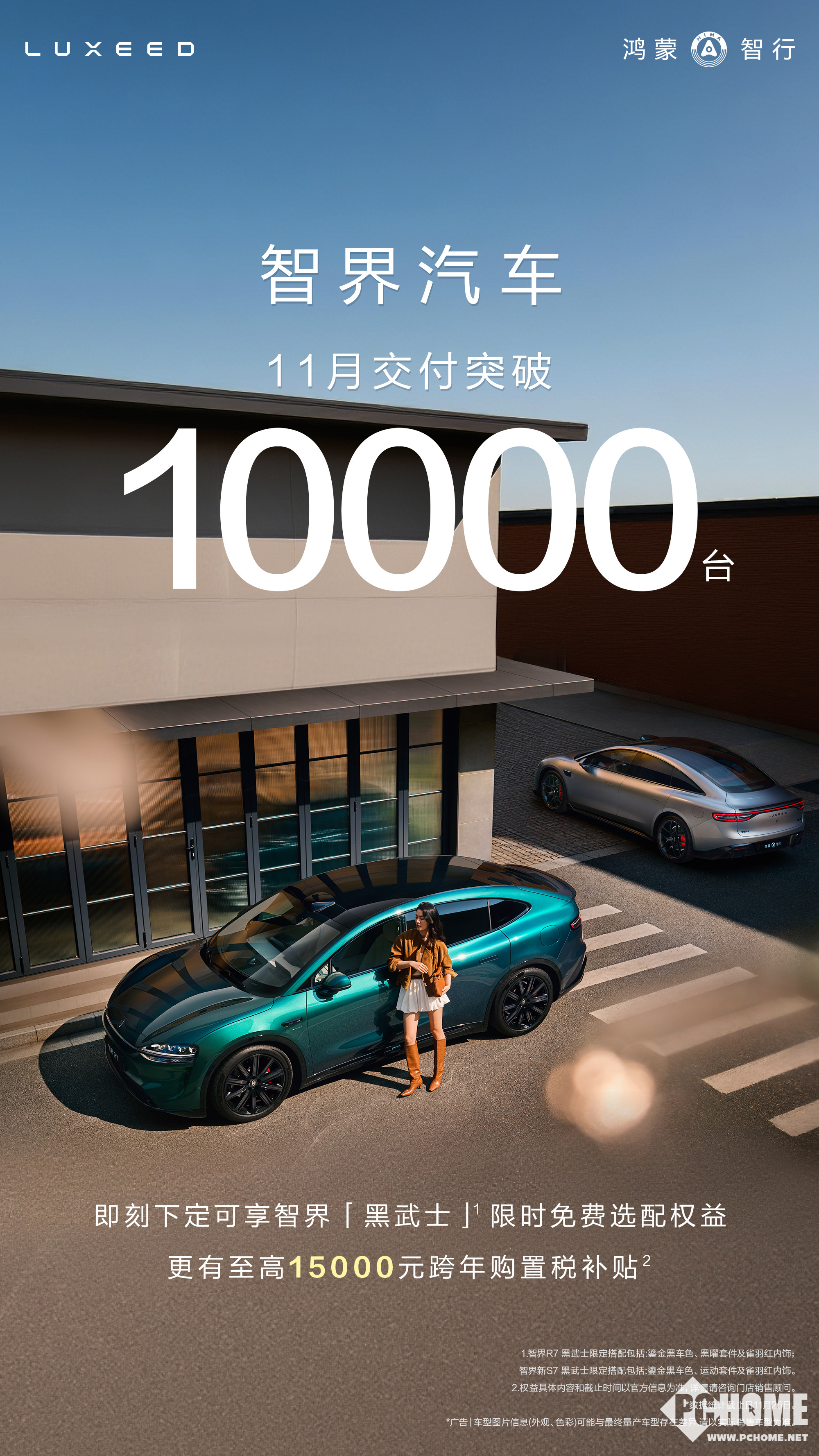 2025年11月28日,智界汽车官方宣布,11月智界汽车交付突破10000台,连续2个月交付过万,连续3个月大定破万。