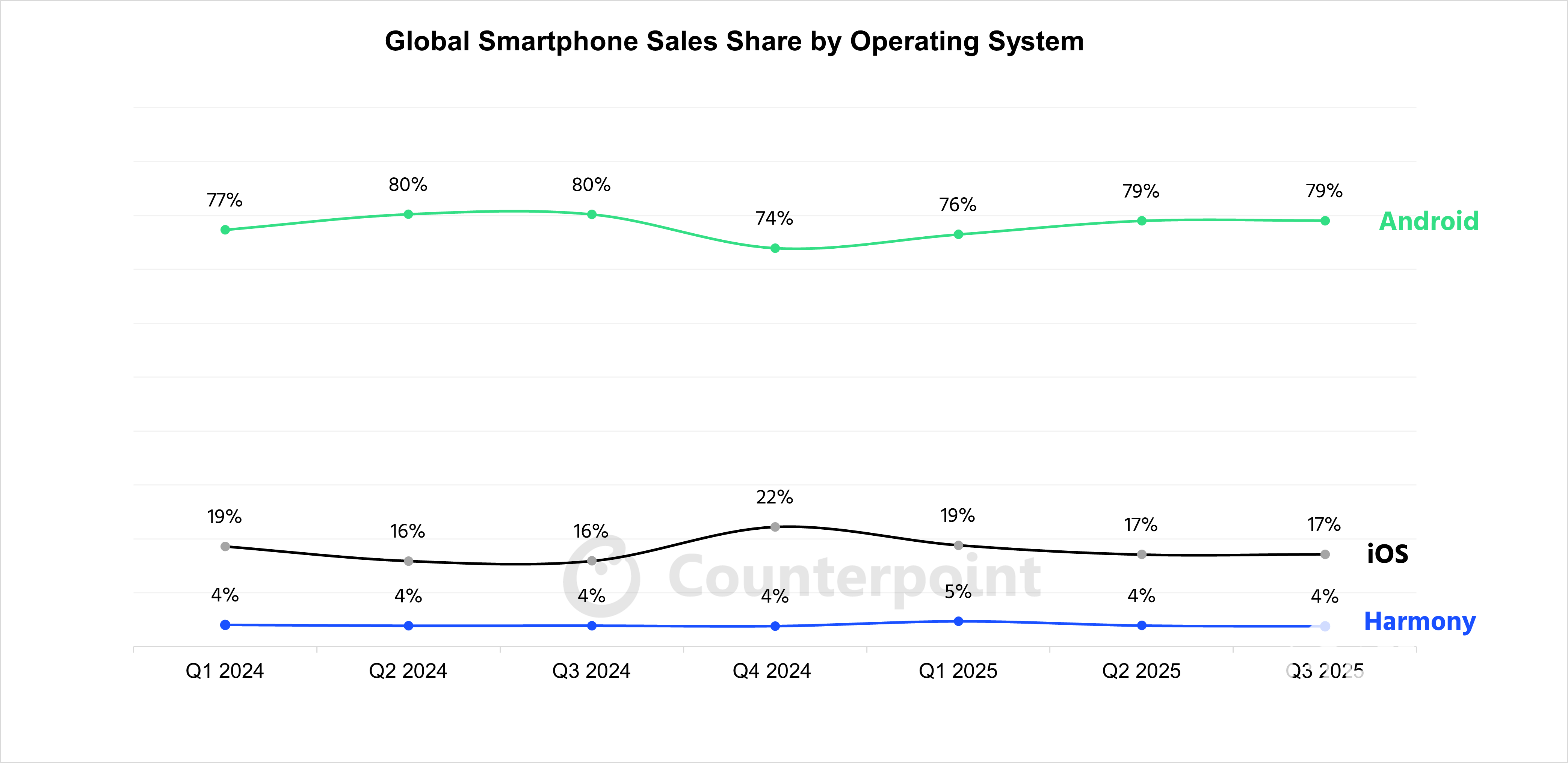 2025年Q3,在全球市场,Android系统的份额为79%,位列第一,同比下降1个百分点;iOS份额17%,较去年同期提升1个百分点,位列第二;HarmonyOS份额4%,位列第三。