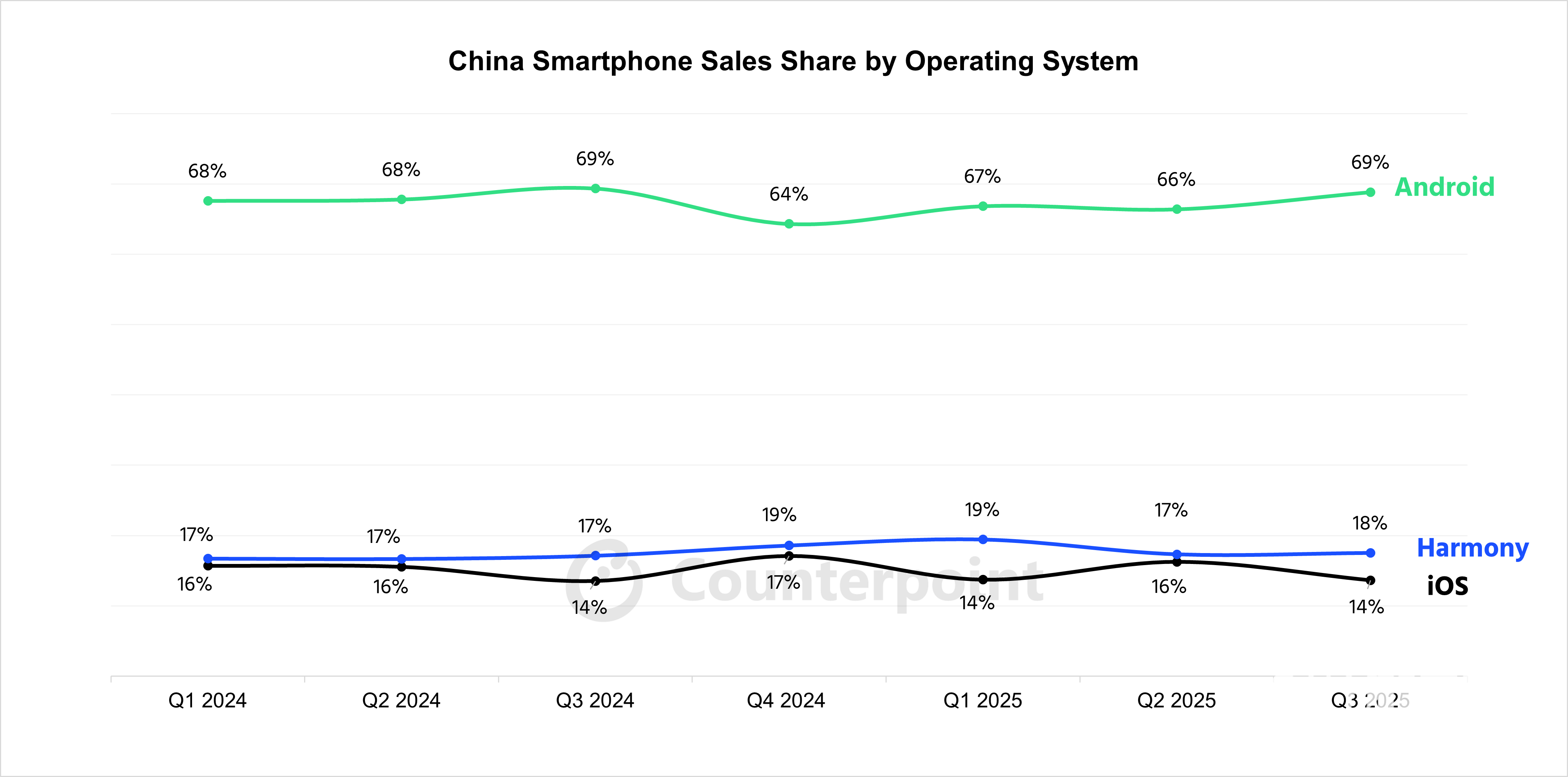 在中国市场,Android系统的份额为69%,位列第一;HarmonyOS份额18%,较去年同期增长1个百分点;iOS份额14%,位列第三,2024年Q4以来,份额一路走低。