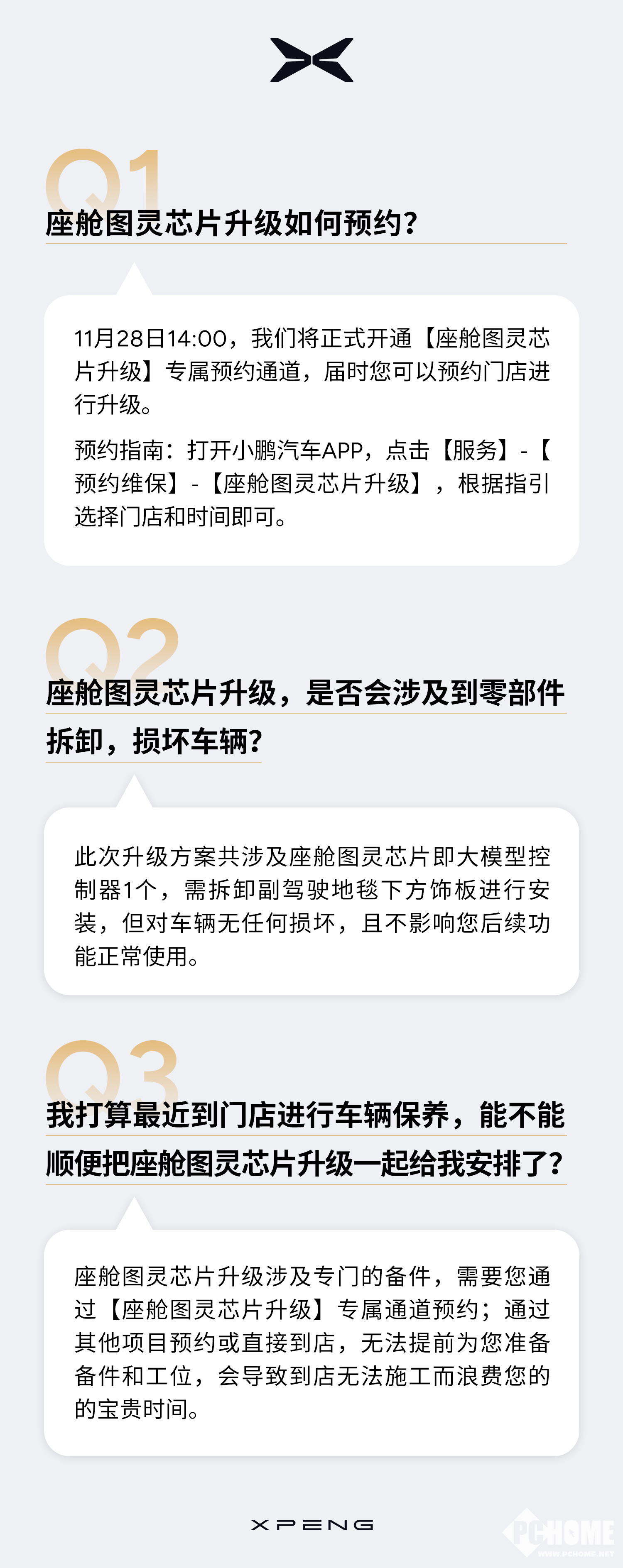 根据官方指引,用户需打开小鹏APP,通过服务-预约维保-座舱图灵芯片升级路径选择门店与时间。值得注意的是,此次升级涉及副驾驶地毯下方饰板拆卸,安装图灵芯片及大模型控制器,但官方明确表示不会对车辆造成损坏,且不影响后续功能使用。对于计划到店保养的用户,小鹏特别提示:芯片升级需专用备件,需通过专属通道预约,若与其他项目合并预约,可能因备件或工位不足导致无法施工。