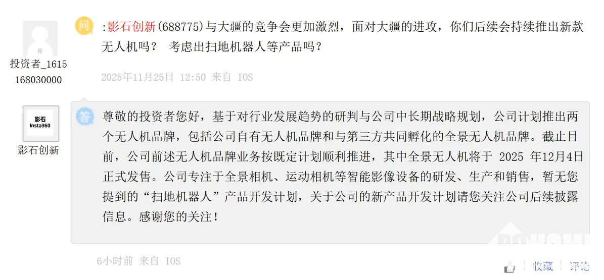 2025年11月28日,影石创新在互动平台确认,公司无人机业务推进顺利,全景无人机产品将于2025年12月4日发售,此举标志着这家全景相机龙头正式攻入大疆主导的无人机核心市场。