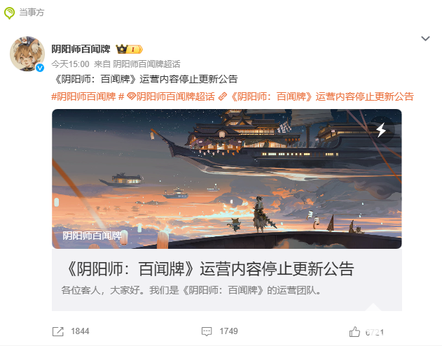 同时,《阴阳师:百闻牌》官方感谢玩家长久以来的陪伴,并为运营内容停更这一消息深感抱歉。