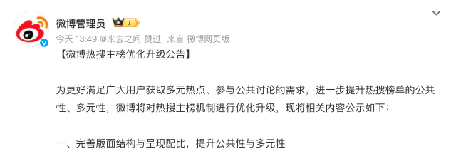 2025年11月28日,微博管理员发布《微博热搜主榜优化升级公告》,宣布对热搜主榜机制进行优化升级,旨在更好满足用户获取多元热点、参与公共讨论的需求,进一步提升榜单公共性与多元性。