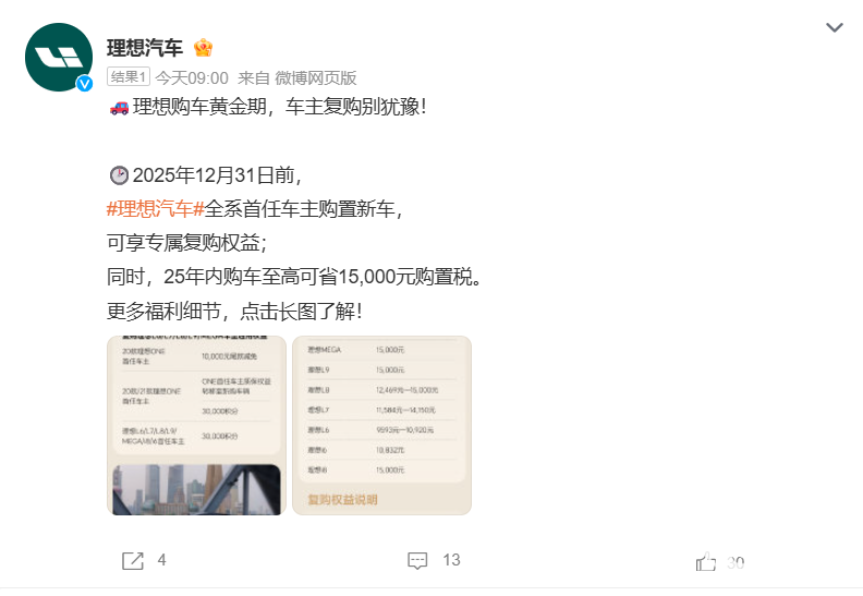 2025年11月29日,理想汽车宣布推出全系首任车主购置新车,可享专属复购权益,同时,25年内购车至高可省15000元购置税。