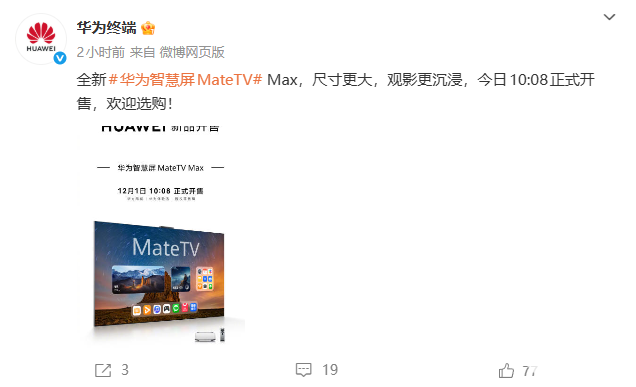 2025年12月1日消息,华为终端微博发布消息,全新华为智能屏MateTV Max今日正式开售,官方售价为64999元。