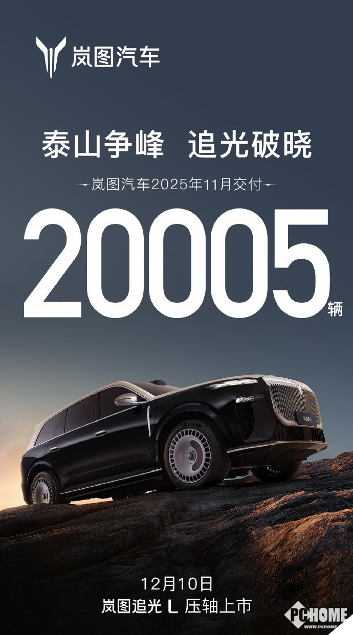 2025年12月1日,岚图汽车官方发布博文,岚图汽车2025年11月交付20005辆,1至11月累计同比增长82%,并宣布,12月10日岚图追光L压轴上市。