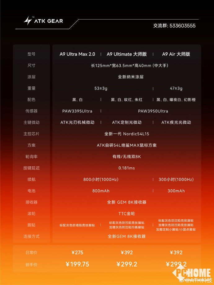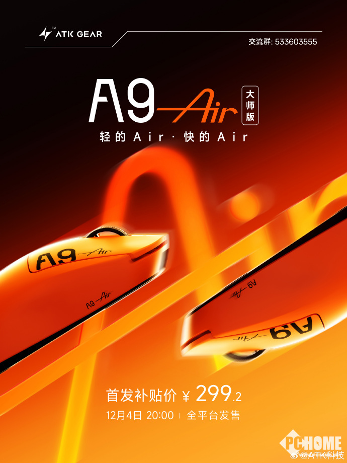 2025年12月1日消息,ATK A9 Air大师版鼠标于12月4日开售,首发价299.2元。